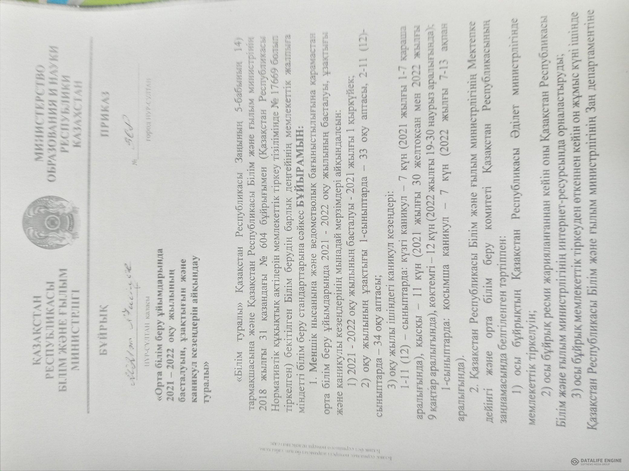 2021-2022 оқу жылының басталуы туралы бұйрық.