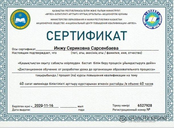 Сәрсенбаева И.С. қашықтықтан оқыту 40 сағаттық сертификат.