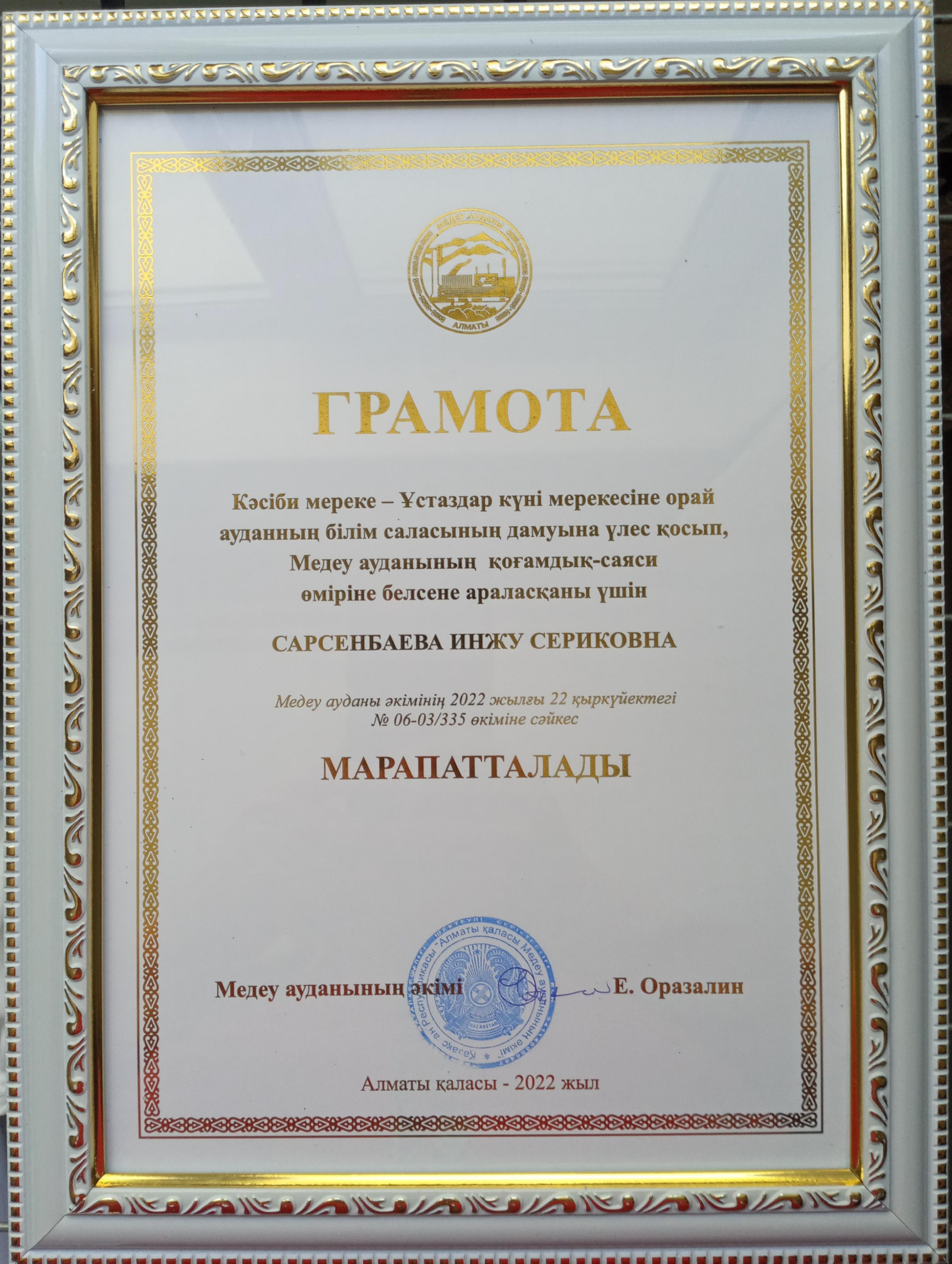 И.С.Сәрсенбаева аудан әкімі Е.Н.Оразалиннің мараптымен мадақталды.