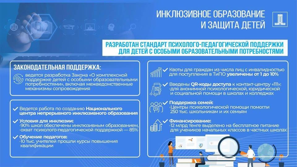 Ведется работа по созданию Национального центра непрерывного инклюзивного образования. В 90% школах страны созданы условия для получения инклюзивного образования, а охват детей специальной психолого-педагогической поддержкой достиг 85%. Сеть специальных организаций образования достигла 504 единиц. Открыт 121 кабинет поддержки детей с особыми образовательными потребностями при школах.