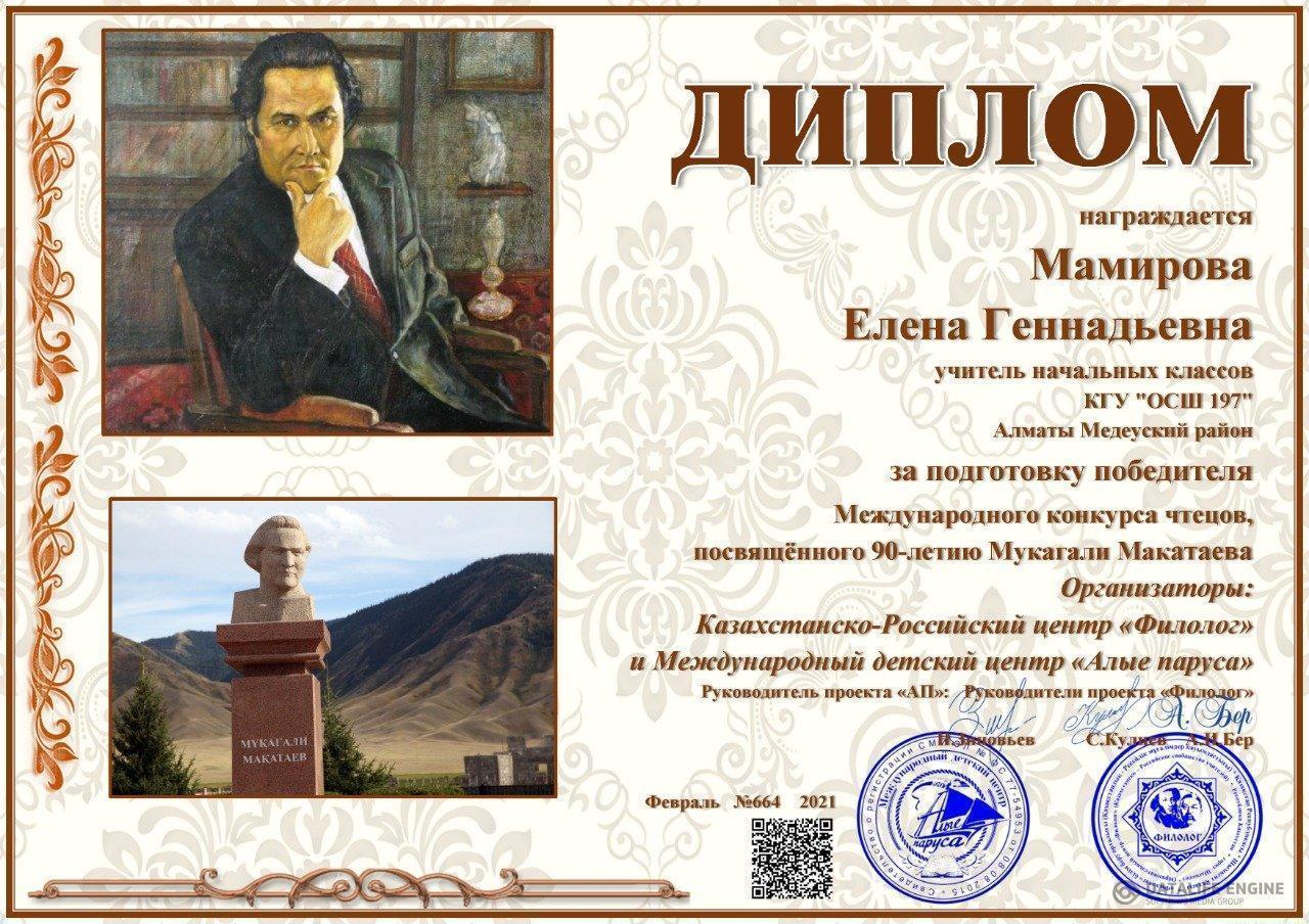Халықаралық онлайн олимпиада. І орын. Мамиров Рият 4 "Б" сынып оқушысы.