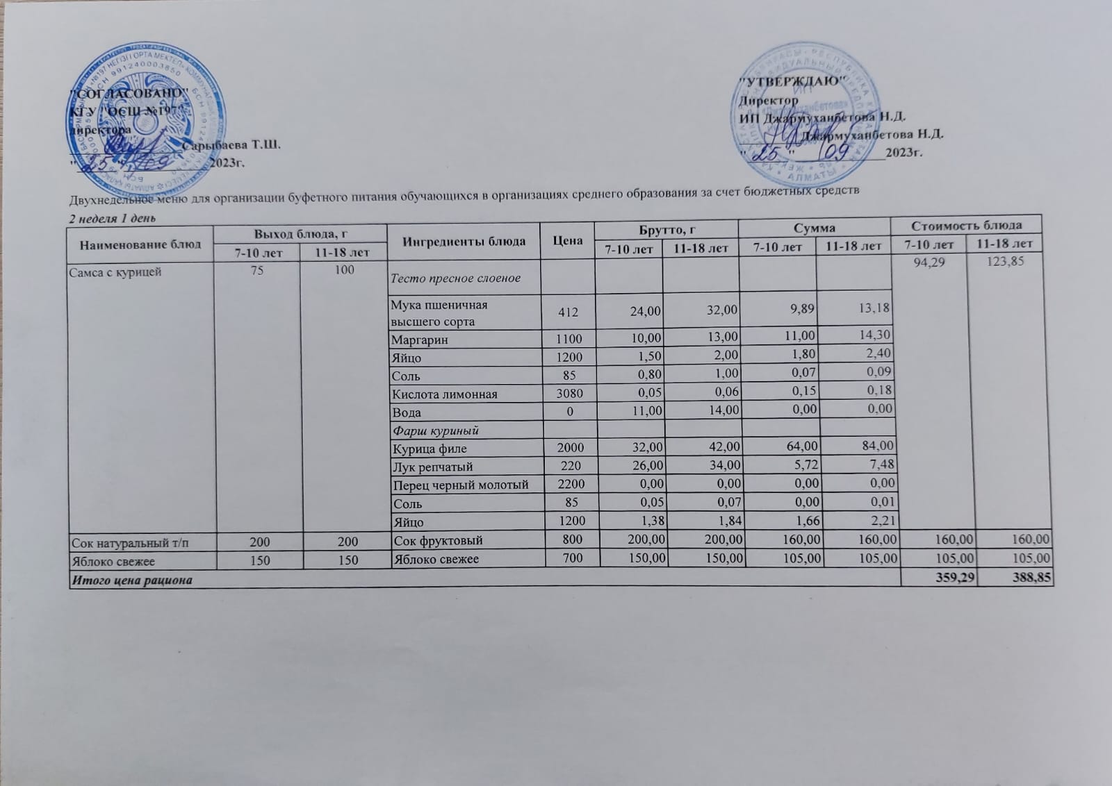 Ас мәзірі 2 апта 1 – ші күн /11.09.2023ж.