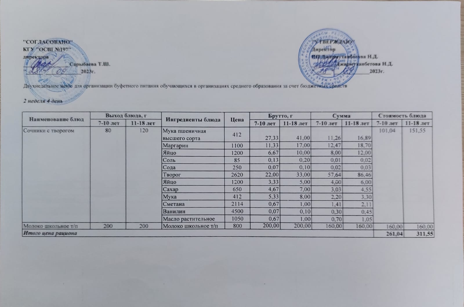Ас мәзірі 2 апта 1 – ші күн /11.09.2023ж.