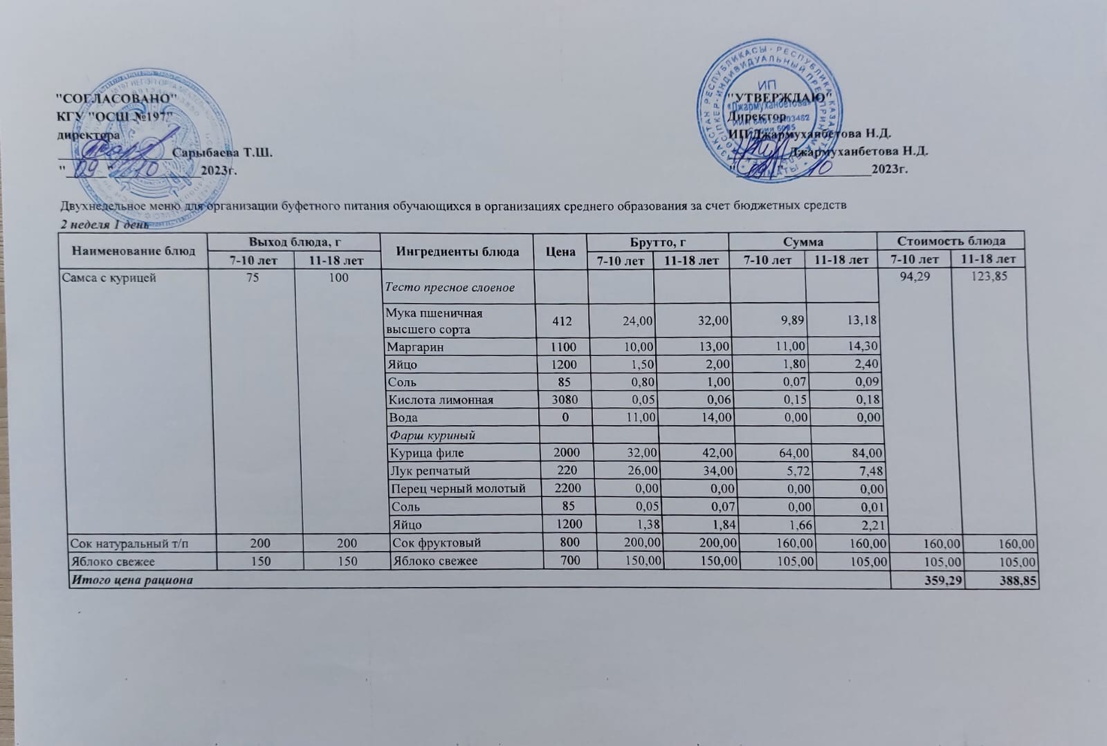 Ас мәзірі 2 апта 1 – ші күн /11.09.2023ж.