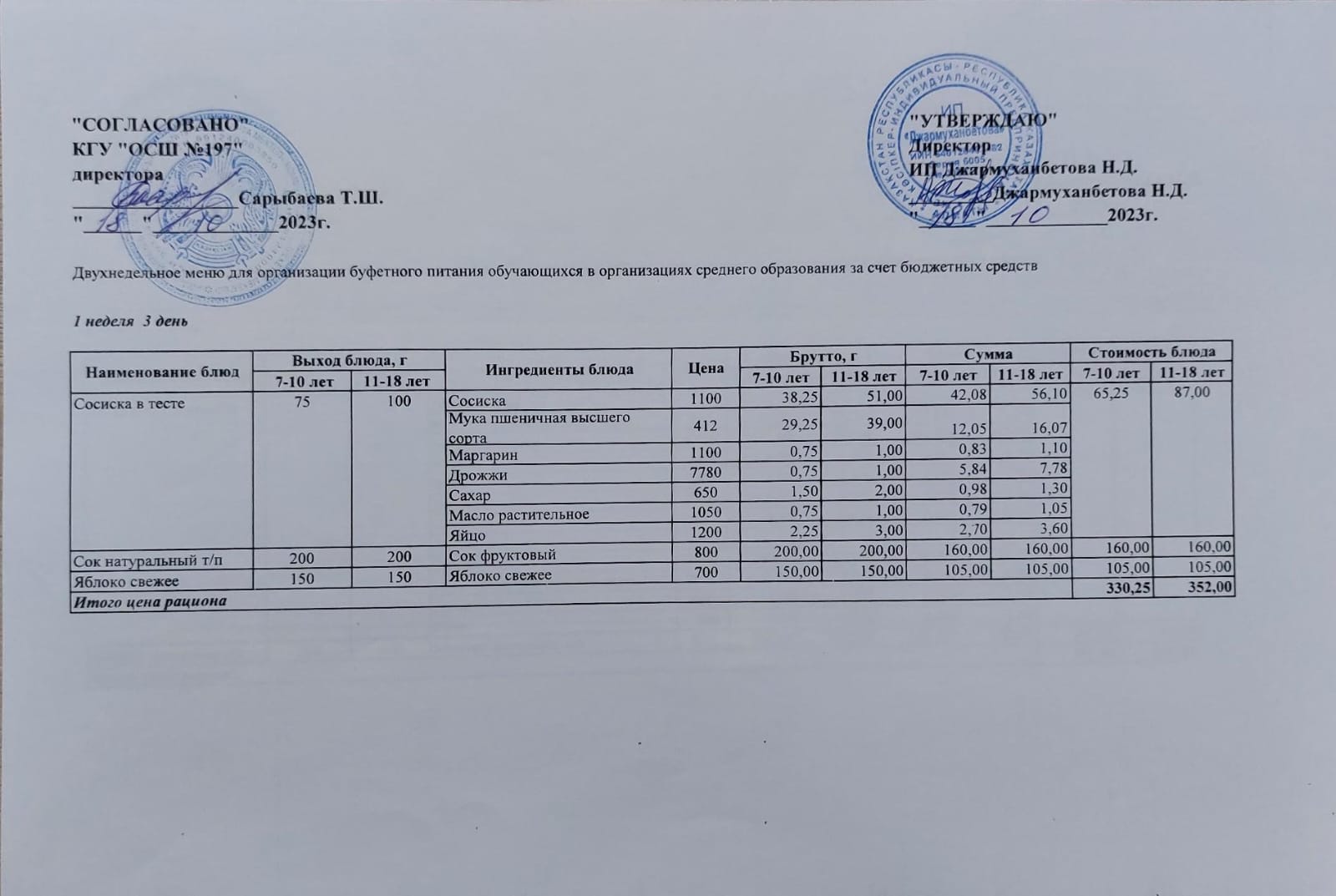 Ас мәзірі 2 апта 1 – ші күн /11.09.2023ж.