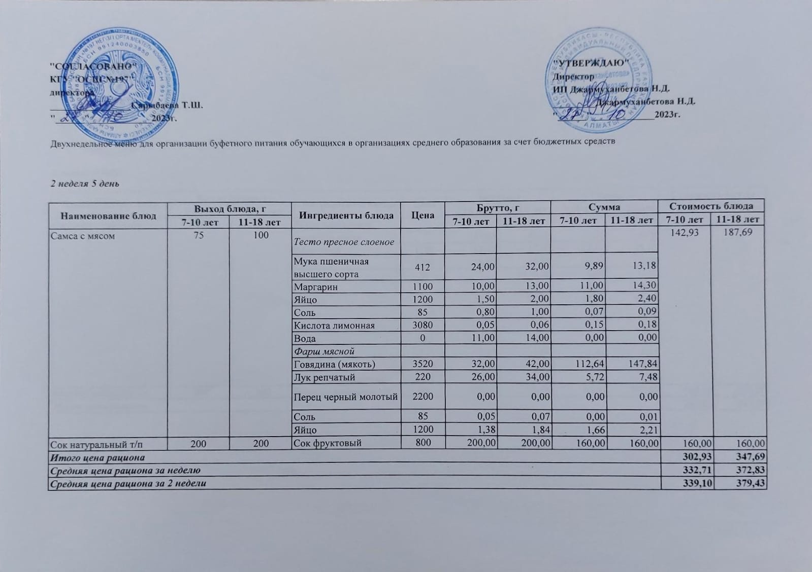 Ас мәзірі 2 апта 1 – ші күн /11.09.2023ж.
