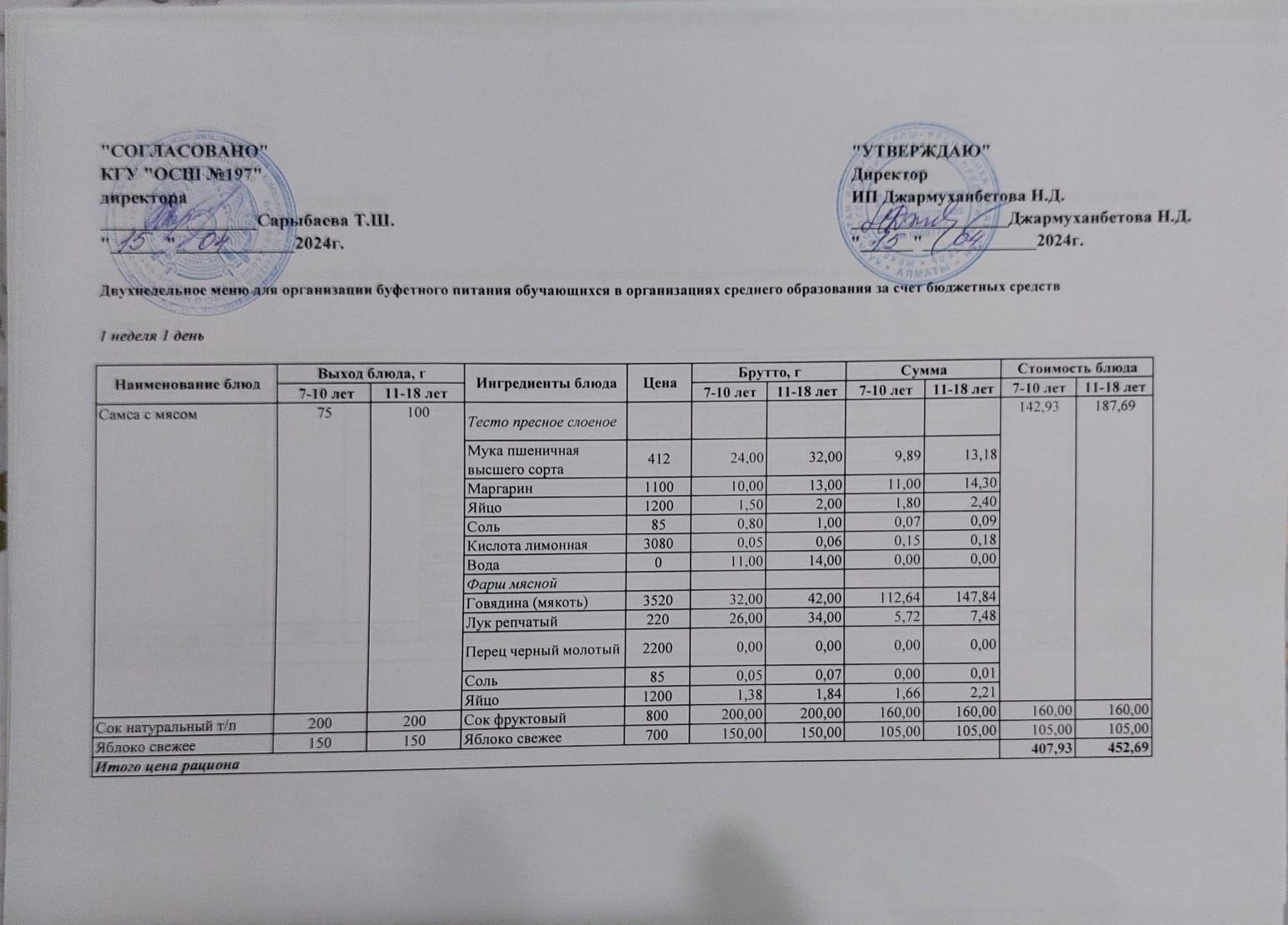 » Ас мәзірі 1 апта 1 - ші күн/ 15.04.2024жыл.
