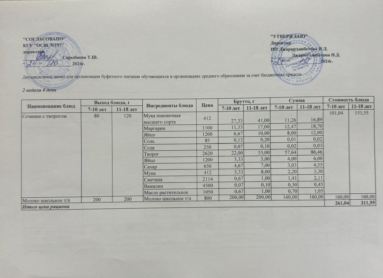 24 октябрь 2024 0 1 2 3 4 5 Күнделікті тегін буфеттік тамақтандыру ас мәзірі 2 апта 4-ші күн / 24.10.2024жыл.