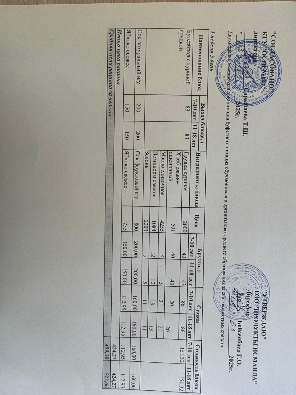Күнделікті тегін буфеттік тамақтандыру ас мәзірі 05.2025