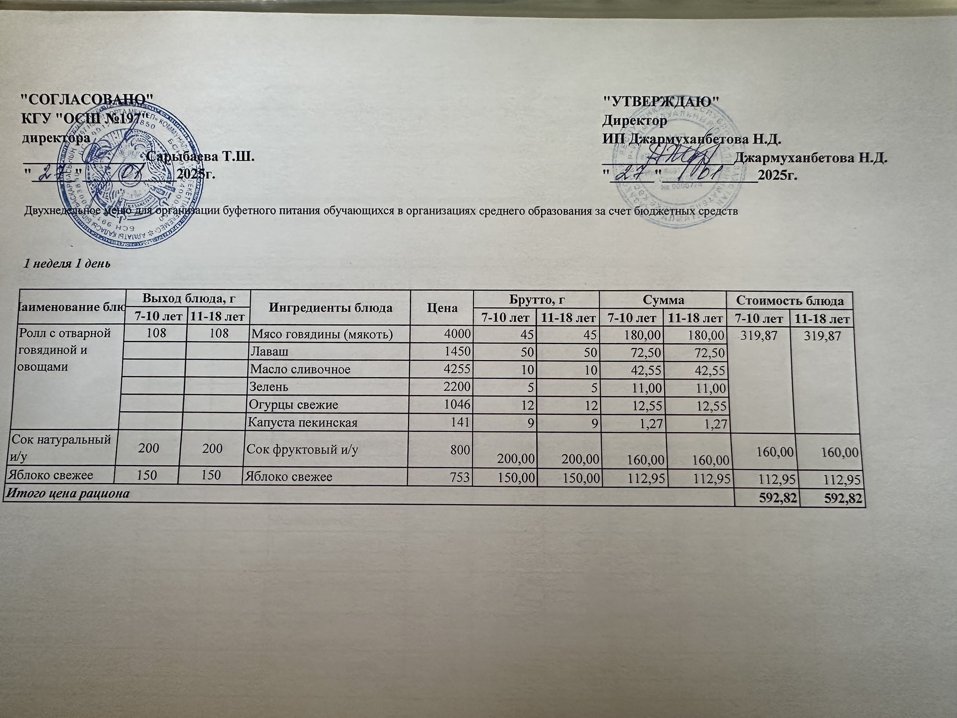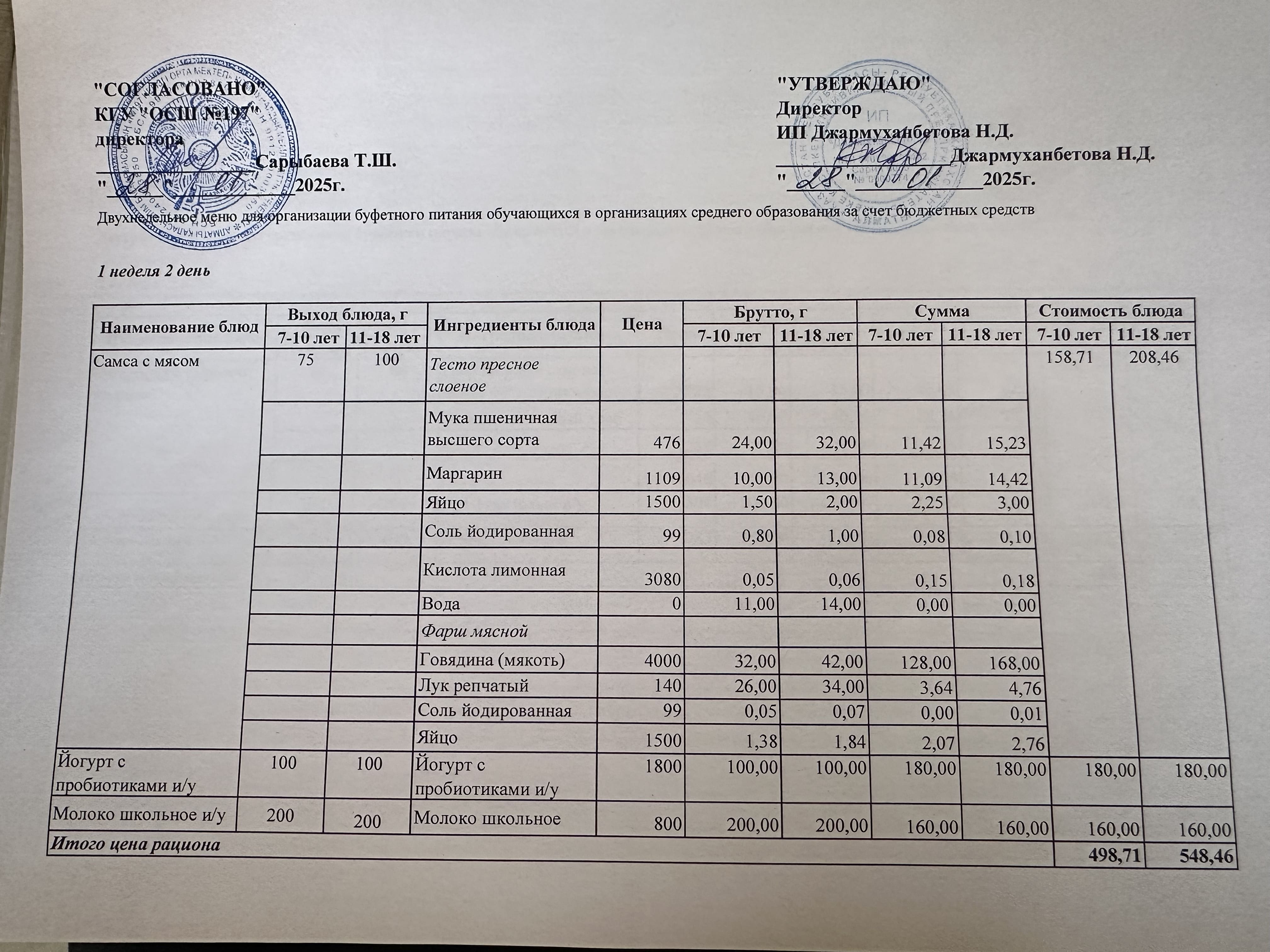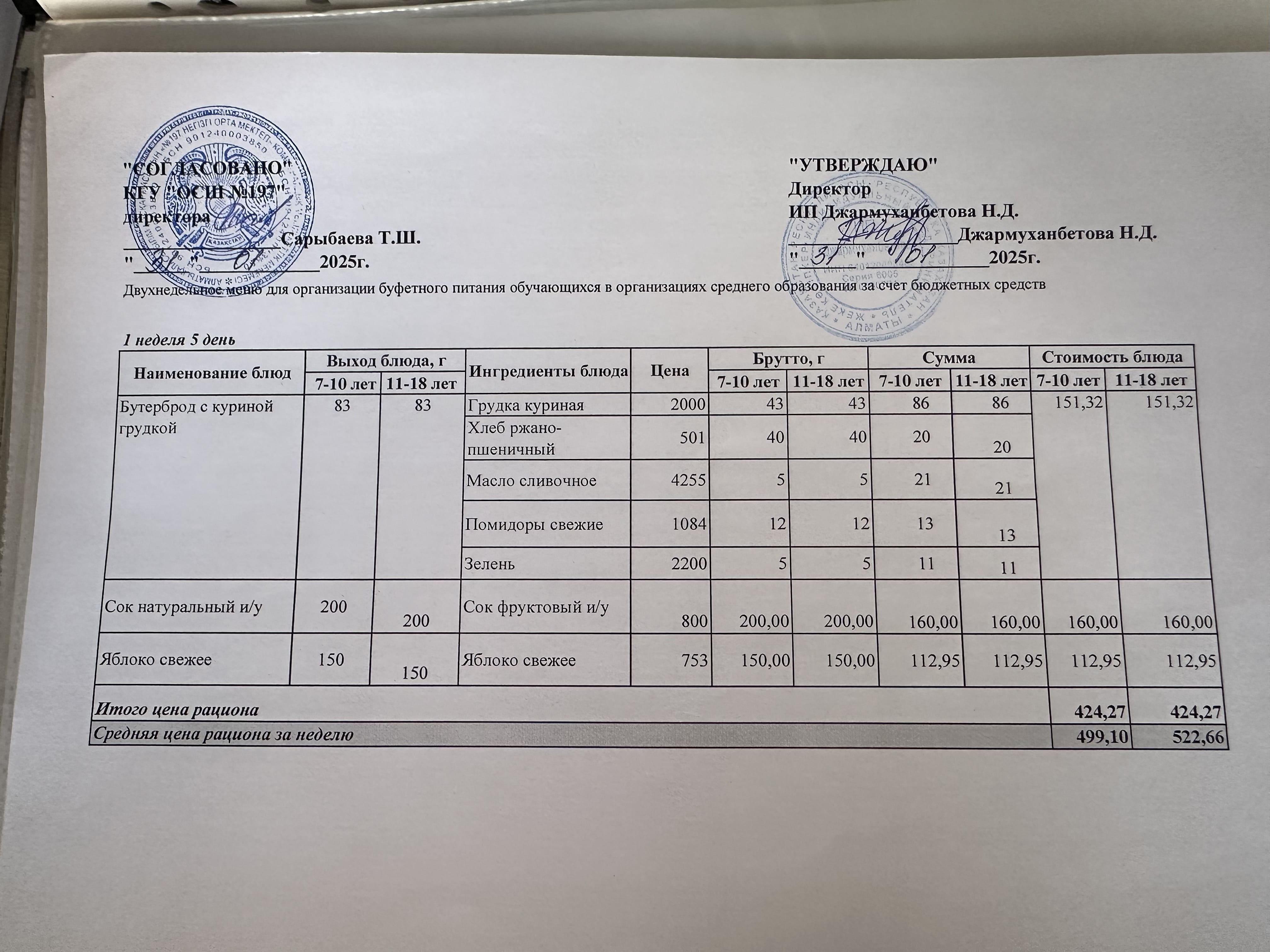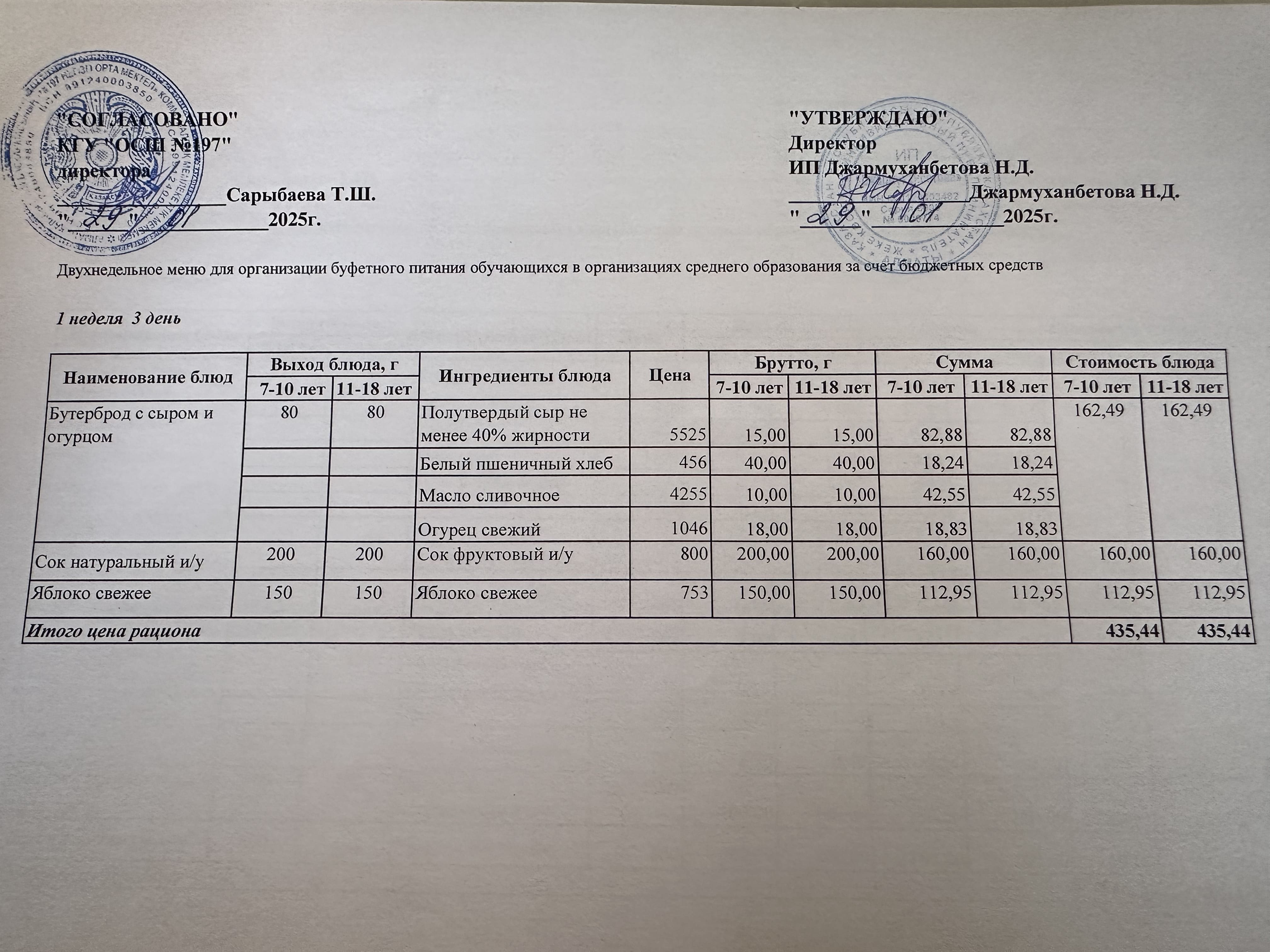 Күнделікті тегін буфеттік тамақтандыру ас мәзірі 1апта 1 -ші күн / 02.09.2024жыл.