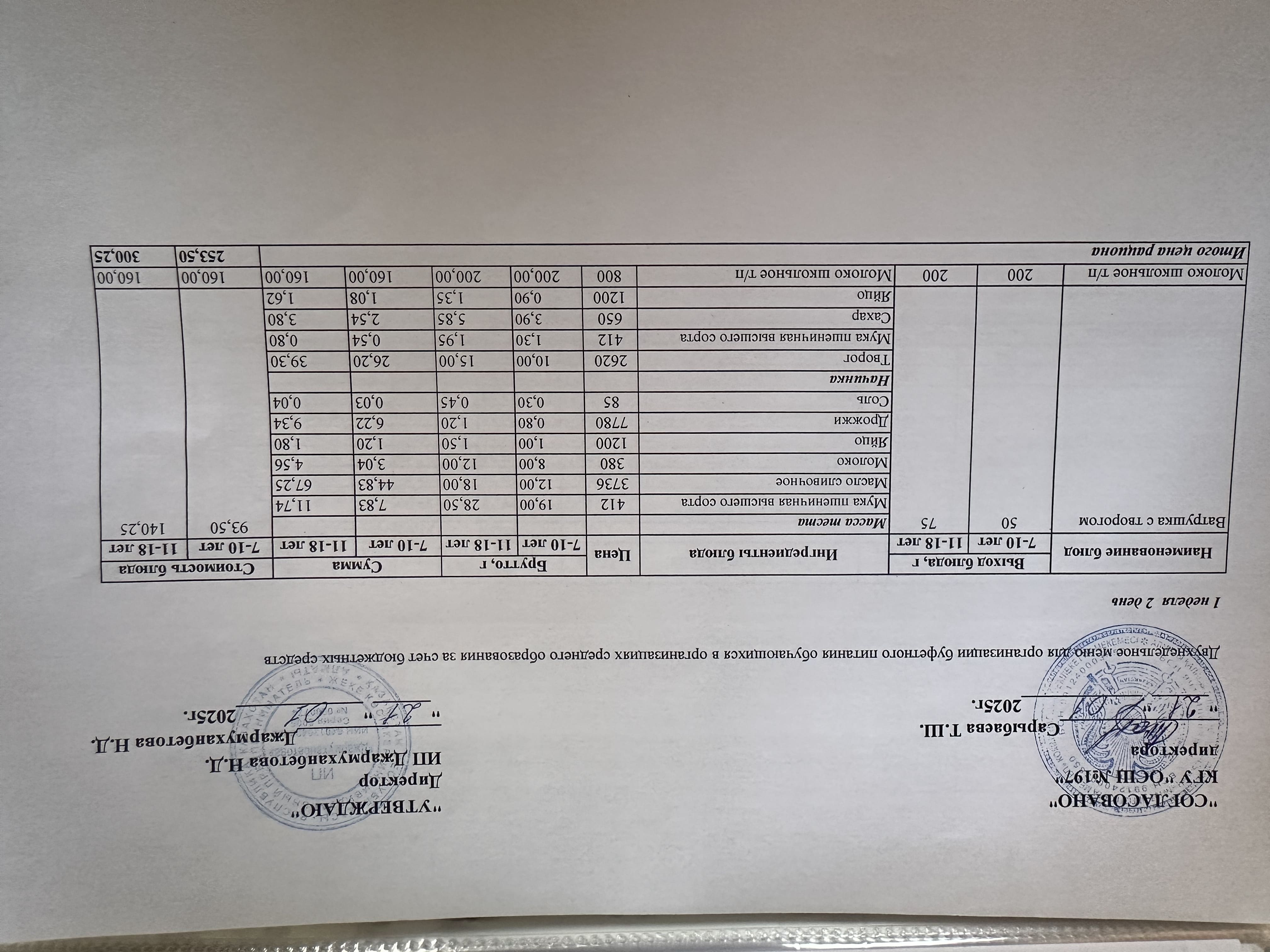 Күнделікті тегін буфеттік тамақтандыру ас мәзірі 01.2025